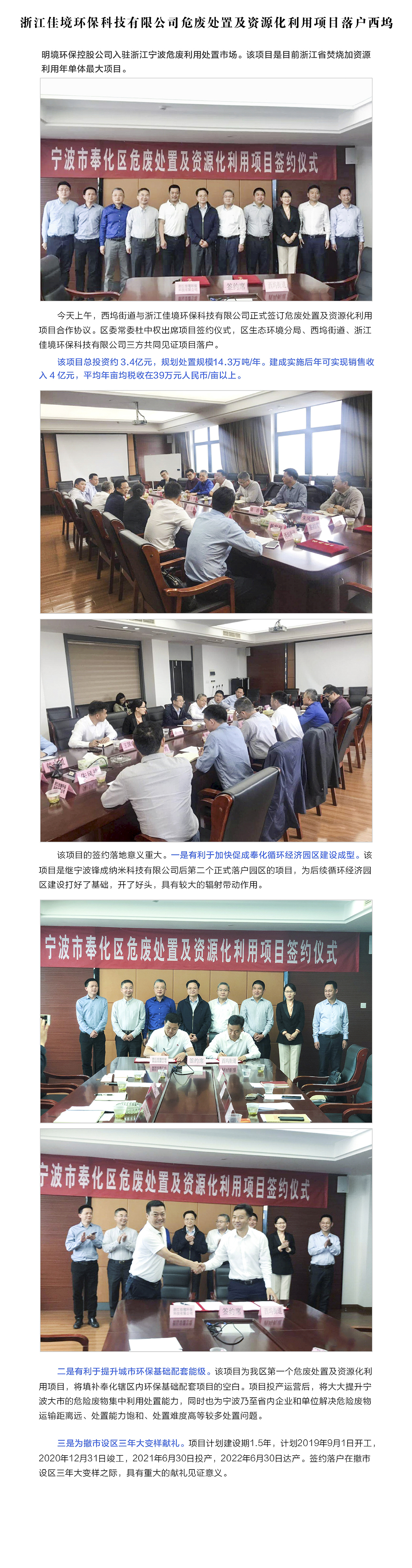 浙江佳境環(huán)保科技有限公司危廢處置及資源化利用項目落戶西塢