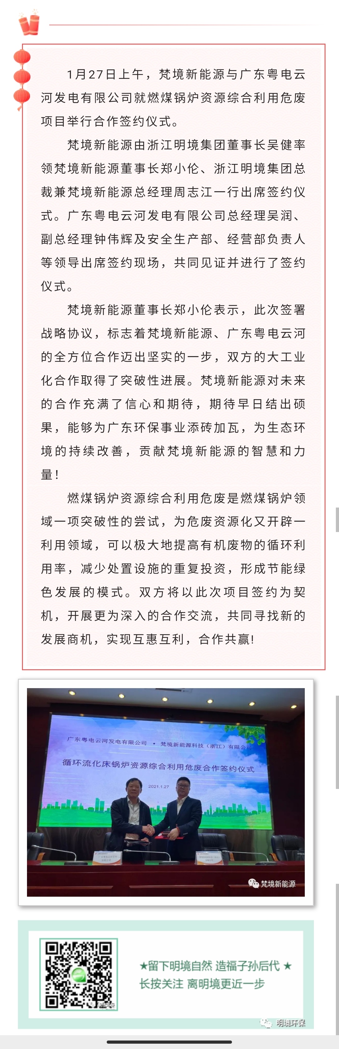 明境環保集團旗下梵境新能源與廣東粵電云河舉行燃煤鍋爐項目合作簽約儀式